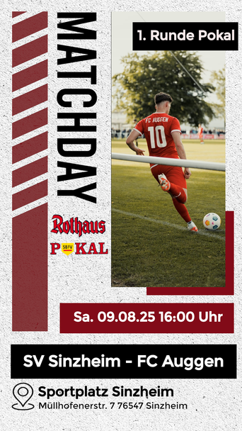Schon am kommenden Samstag um 16:00 Uhr muss unser Team in der 1. Runde des Südbadischen Pokals auswärts beim SV Sinzheim antreten. Wir hoffen auf zahlreiche Fans, die uns